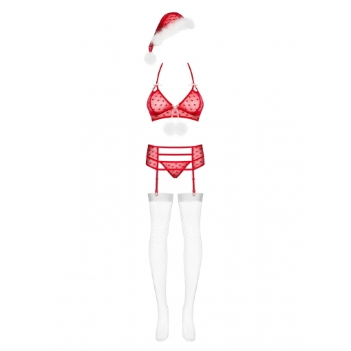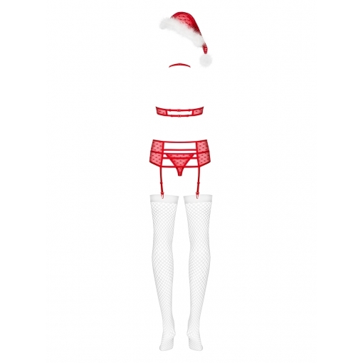 В комплект входит: бюстгальтер, трусики, широкий пояс для чулок, чулочки и колпачок.