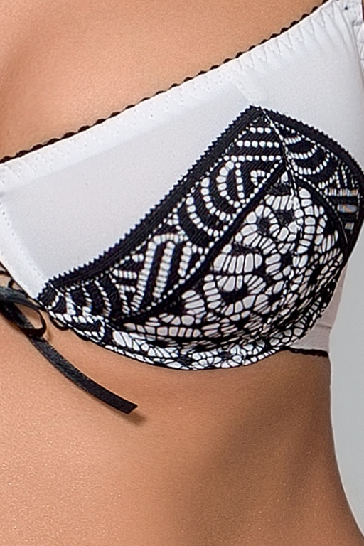 Комплект сексуального белья черно-белого цвета с интересным узором. Сложный абстрактный узор отлично смотрится на белом фоне, акцентируя внимание на красоте женской фигуры. Лиф, трусики, пояс для чулок входят в комплект.