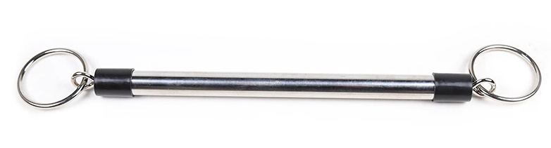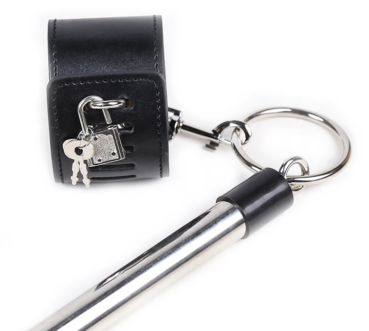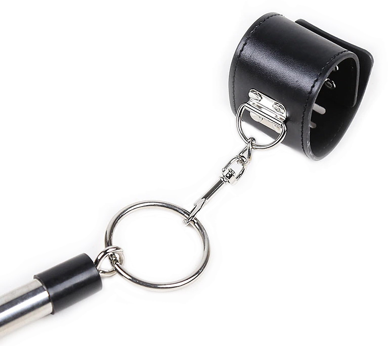 Выполненная из металла серебристого цвета, распорка оснащена креплениями для оков. Наручники из искусственной кожи надежно крепятся к распорке с помощью карабинов и прочно фиксируются на запястьях.