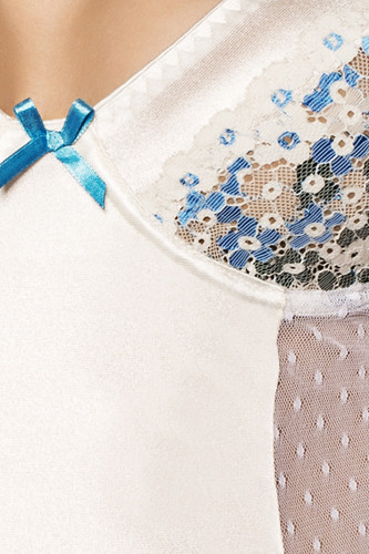 Элегантный корсет Angel выполнен из нежного эластичного атласа кремового цвета и вставок из тюля в горошек, отделан белым итальянским кружевом с мотивом зелено-голубых цветов.