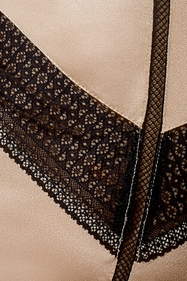 Корсет выполнен из эластичного сатина золотого цвета. Модель дополнена вставками из изящного кружева. Детали: регулируемые по высоте бретели, чашечки на косточках, эластичные ленты для чулок, декоративные бантики. В комплект прилагаются трусики.
