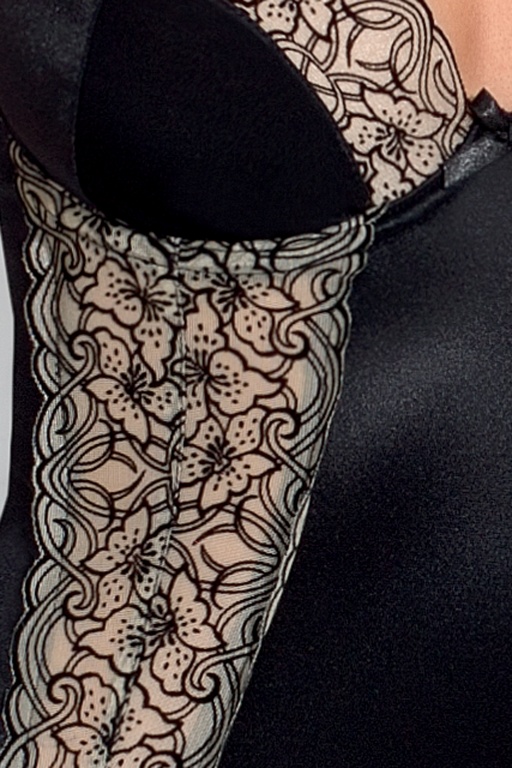 Элегантный корсет изготовлен из глянцевого эластичного атласа, оформлен полосками из прозрачной ткани с цветочными бархатистыми узорами. Лиф на косточках. Сзади корсет застегивается на крючки, имеется 2 ряда петелек для регулирования объема. Длина бретелек регулируется.