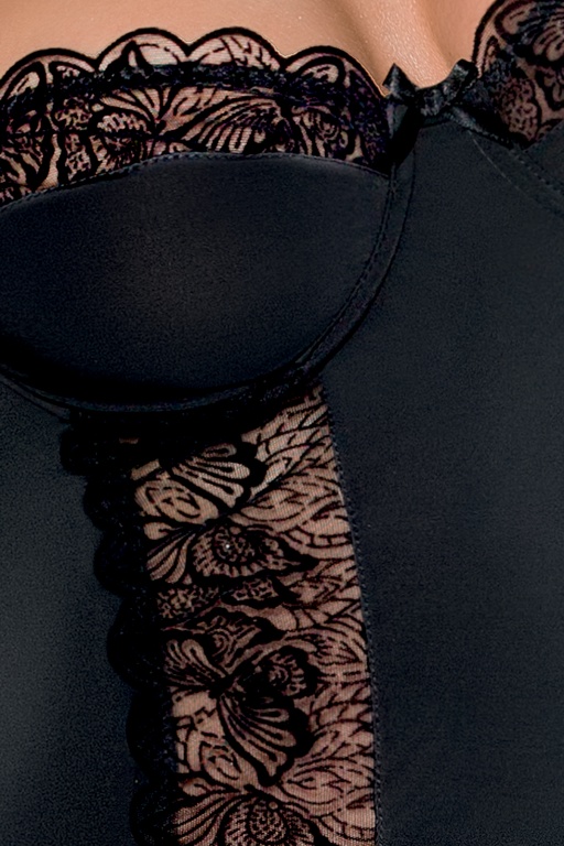 Элегантный корсет выполнен из испанской черной микрофибры и элегантного кружева. Чашечки усилены косточками, регулируемые ремни, съемные застежки для чулок к комплекту прилагаются трусики-стринг.