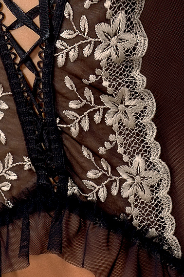 Корсет выполнен из нежного тюля и элегантной вышивки. Модель дополнена вставками из изящного кружева. Детали: регулируемые по высоте бретели, чашечки на косточках, эластичные ленты для чулок, декоративные бантики.