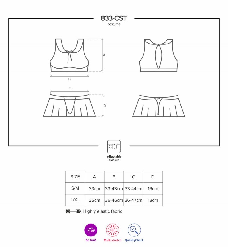 В комплект входят: топ, юбка - стринги, кружевные носки.