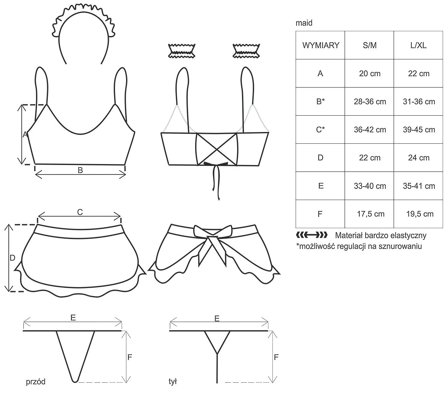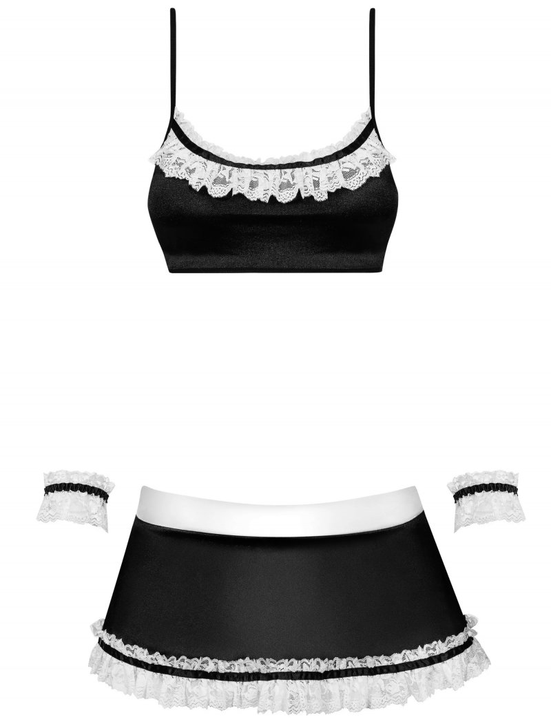В комплект входят: топ на бретелях, юбка, трусики-стринги, кружевные манжеты и повязка на голову.