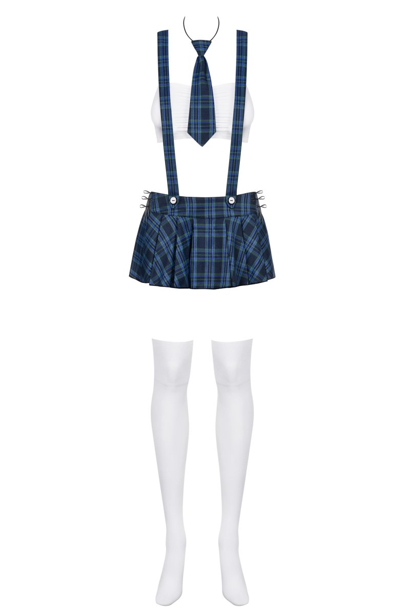 Детали: костюм школьницы с модными аксессуарами, удобный, белый топ спортивного кроя, синий клетчатый галстук, короткая юбочка со складками, окантовка по бокам юбки, сексуальные подтяжки перекрещены на спине, белые стринги и гольфы в комплекте, красивая ткань.