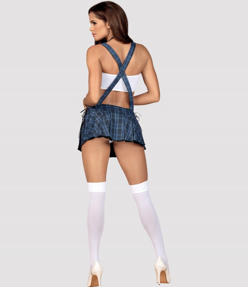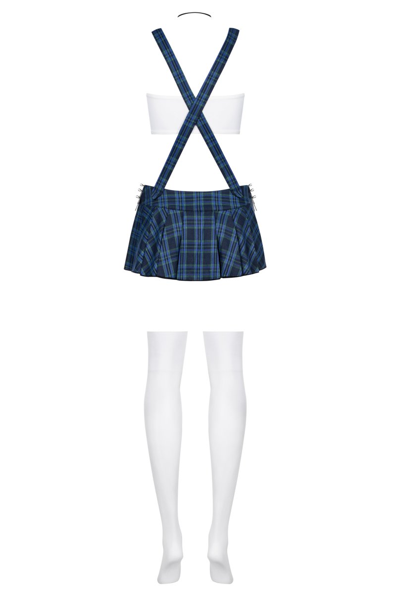 Детали: костюм школьницы с модными аксессуарами, удобный, белый топ спортивного кроя, синий клетчатый галстук, короткая юбочка со складками, окантовка по бокам юбки, сексуальные подтяжки перекрещены на спине, белые стринги и гольфы в комплекте, красивая ткань.
