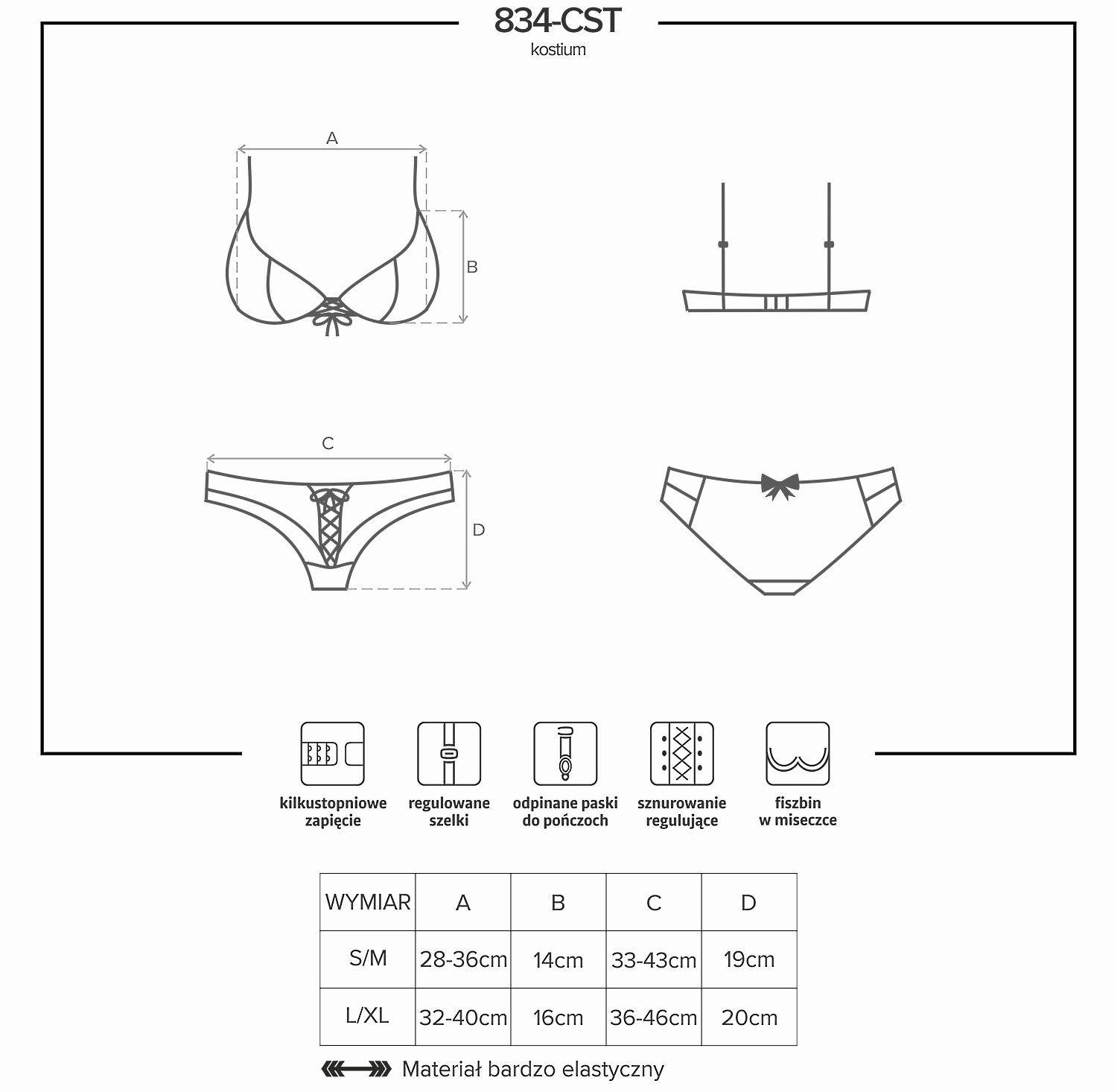 В комплект входят: бюстгальтер, ободок на голову, трусики-шортики со съемными бретелями для чулок.