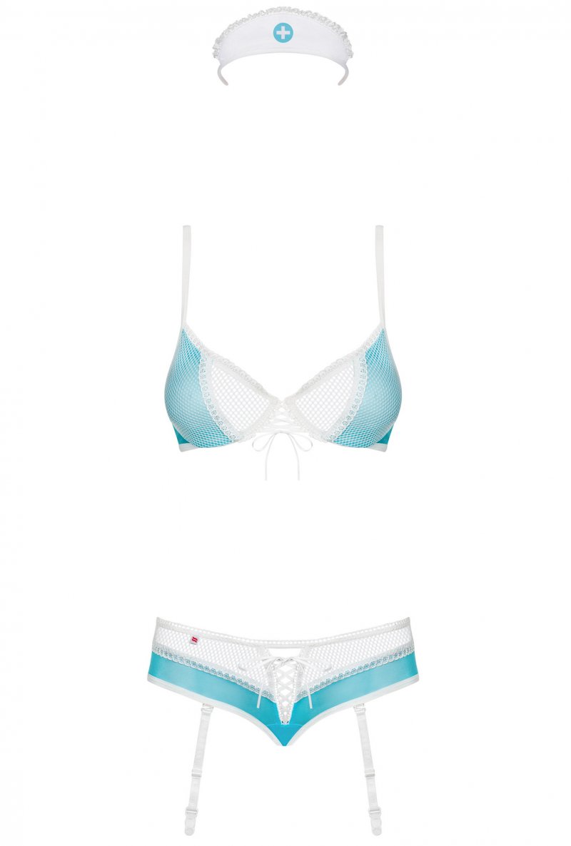 Детали: соблазнительный костюм озорной медсестры, бюстгальтер с чашечками на косточках - идеальная поддержка бюста, регулируемые бретели и трехступенчатая застежка - еще лучшая посадка, кокетливая шнуровка между чашками и на трусиках усиливает атмосферу, съемные бретели для чулок с регулируемой длиной, все это дополнительно украшено изящными атласными бантами - ведь важна каждая деталь, приятные на ощупь эластичные ткани.