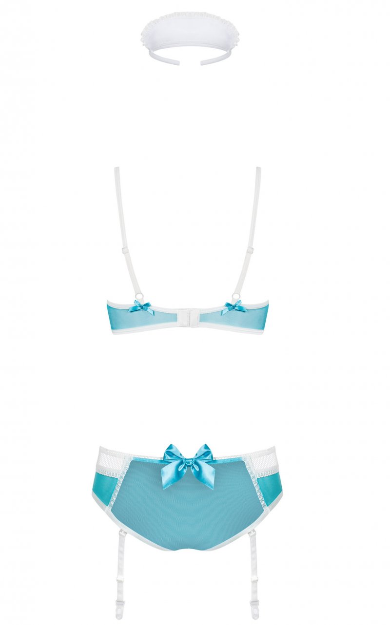 Детали: соблазнительный костюм озорной медсестры, бюстгальтер с чашечками на косточках - идеальная поддержка бюста, регулируемые бретели и трехступенчатая застежка - еще лучшая посадка, кокетливая шнуровка между чашками и на трусиках усиливает атмосферу, съемные бретели для чулок с регулируемой длиной, все это дополнительно украшено изящными атласными бантами - ведь важна каждая деталь, приятные на ощупь эластичные ткани.
