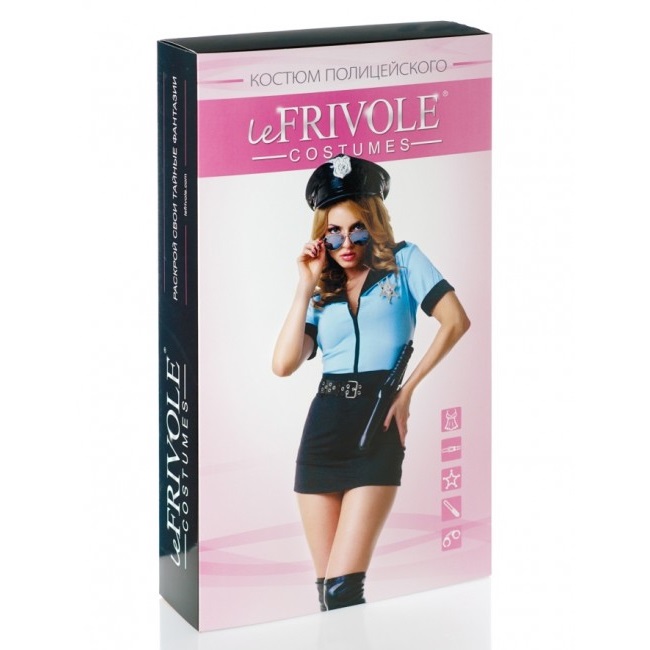 Костюм состоит из: обтягивающего платья на молнии с полицейским значком, блестящего лакового пояса, пластмассовых наручников с ключом и полицейской дубинки.