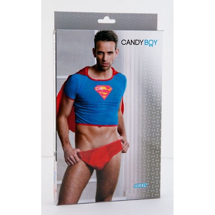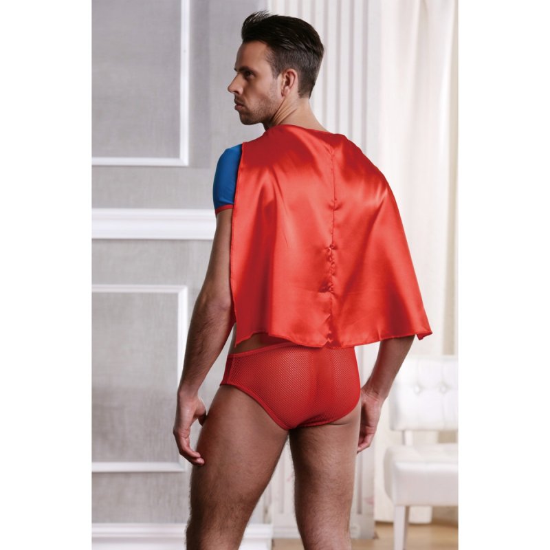 В костюм входит синяя майка со знаком супермена на груди и коротким красным плащом, красные полупрозрачные трусы.
