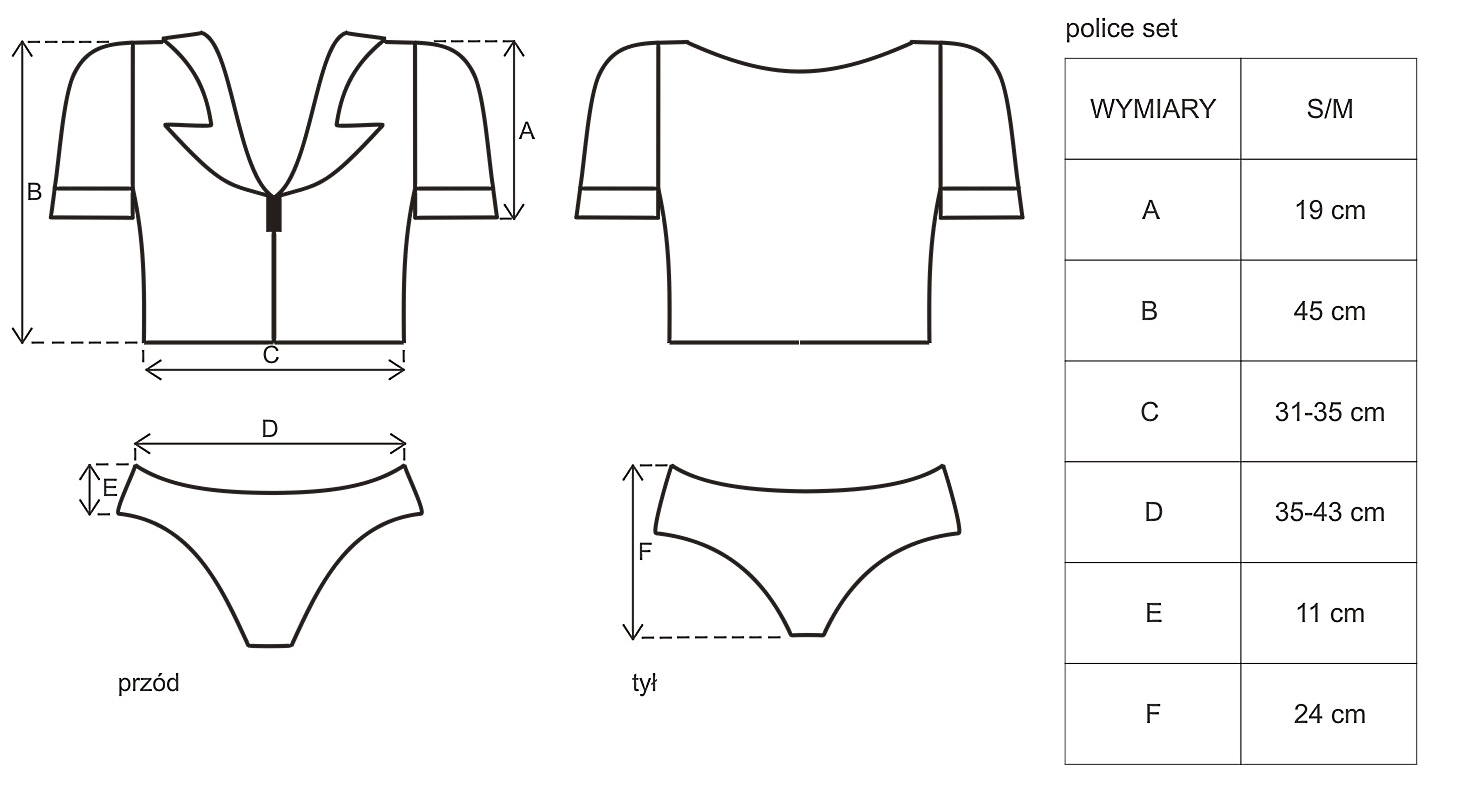 На сексуальном топе есть виниловая фурнитура: воротник, манжеты и нагрудный карман. Так же он декорирован значками: на правом плече и над левой грудью значки с надписью Police. Застегивается спереди на молнию.