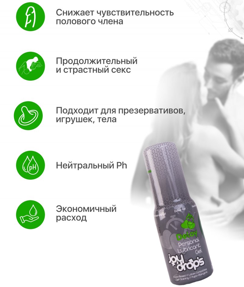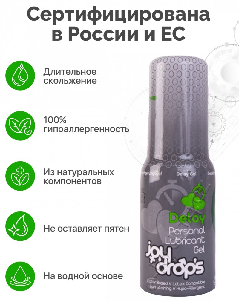 Пролонгирующий лубрикант Joydrops Delay обладает мягким успокаивающим и заживляющим действием благодаря уникальному составу.