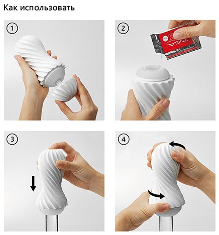 Зажатое отверстие для воздуха на верхней части корпуса во время использования создает вакуумный эффект, что в свою очередь создает спиральные движения самого корпуса! С отпущенным отверстием мастурбатор используется как обычно или со самостоятельным скручиванием корпуса.