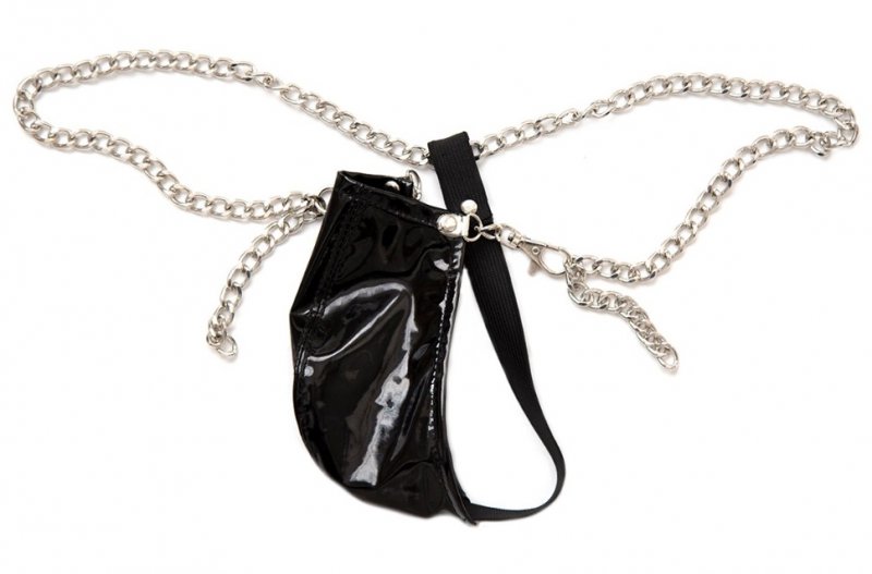 Модель из лакированной кожи сексуально подчеркивает бедра и имеет универсальный размер, регулируемый цепочками на карабинах.