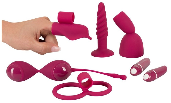 В комплект входят 2 силиконовых минивибратора с покрытием из полиуретана (6,8 х 2,1 см. и 8,6 х 2,1 см.), вагинальные шарики на гибкой сцепке массой 80 г. (20,5 х 3,7 см.), двойное эрекционное кольцо для пениса и мошонки, пальчиковый вибратор (длина 7,5 см.), насадка для вибратора (10 х 4 см.), анальная пробка со спиральной втулкой (11 х 2,5 см.).