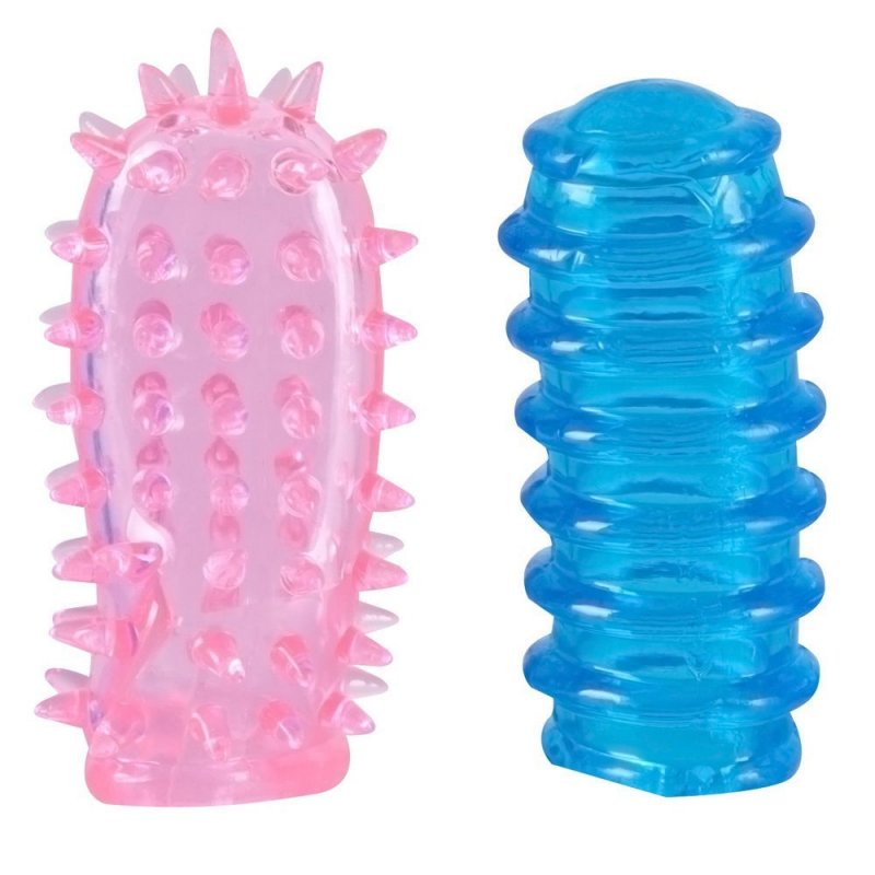 Две разноцветные насадки на пальцы, изготовленные из силикона, каждая из которых имеет разные текстуры - одна насадка с небольшими выпуклыми пупырышками, а другая ребристая.