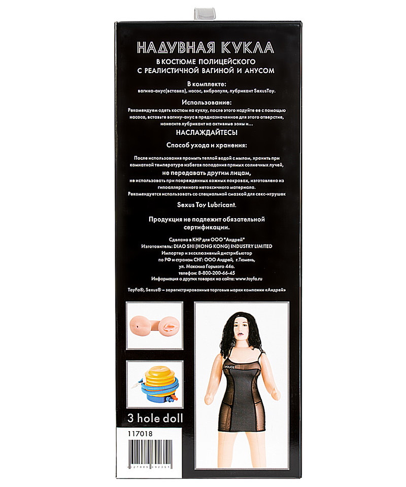 В комплекте: насос для надувания и стравливания воздуха, вставка-тоннель, виброэлемент, костюм полицейского, кукла