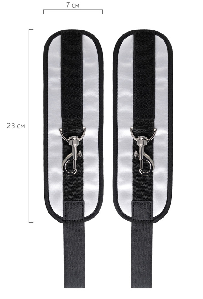 Размеры: общая длина наручников 23 см; ширина наручников 7 см; длина ремней 26 см; диаметр цилиндра 2,5 см