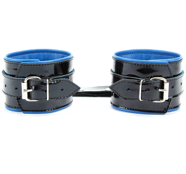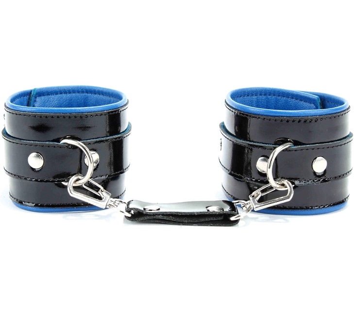 Шикарные наручники на пряжке, выполненные из натуральной лакированной кожи черного цвета с синим подкладом, выполненным из мягкой перчаточной кожи.