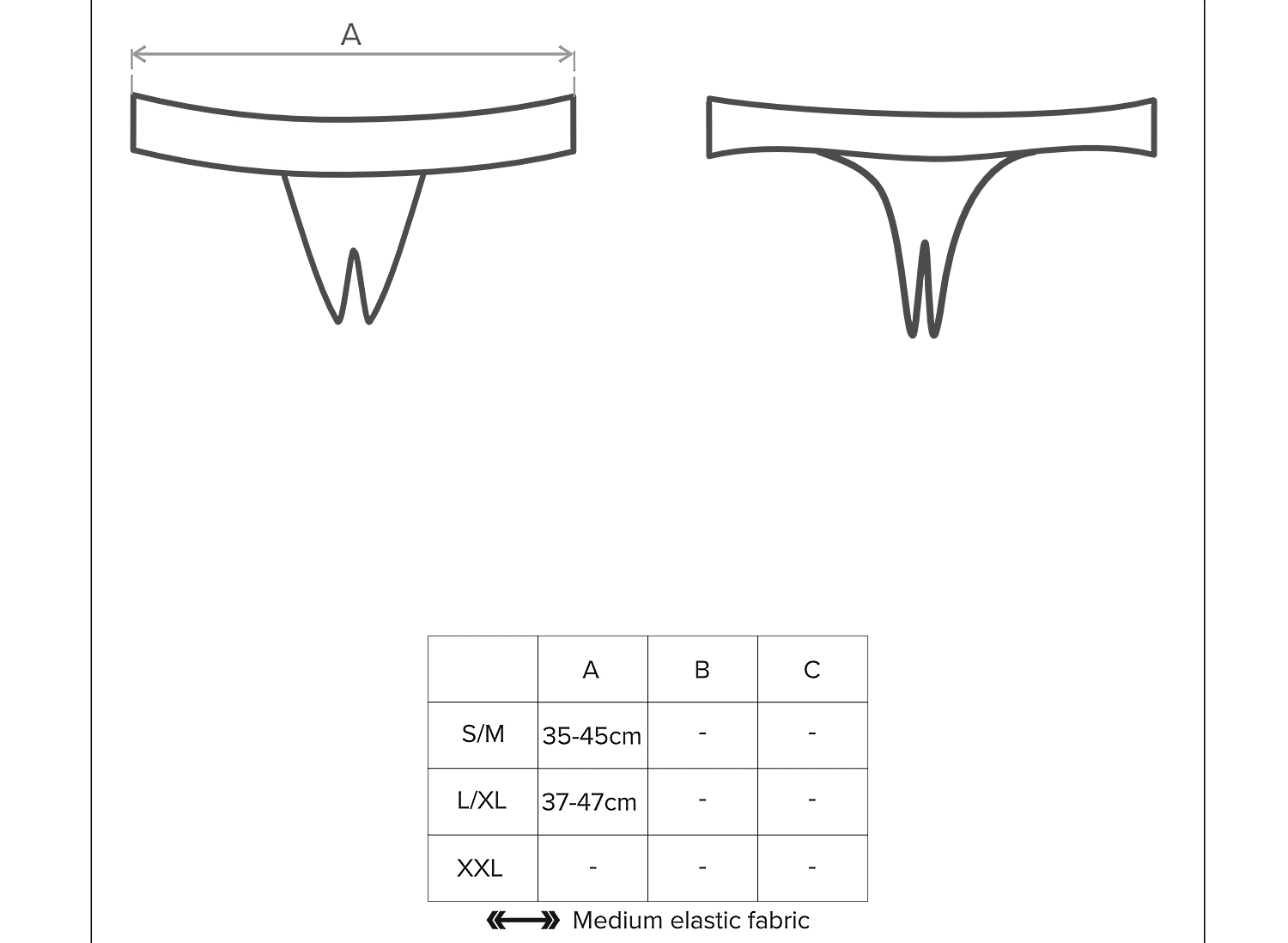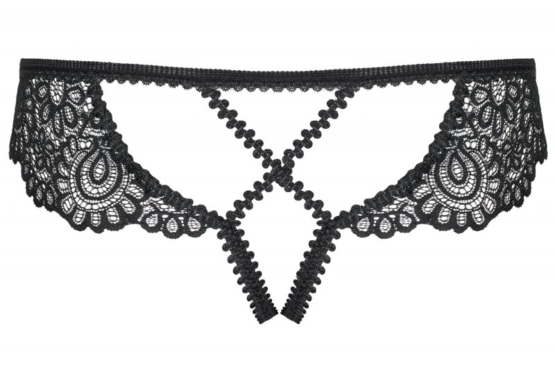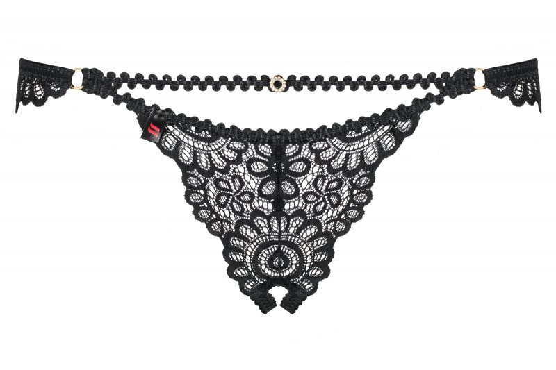 Детали: красивые, соблазнительные трусики, перекрещенные полосы на ягодицах смотрятся великолепно, эластичное кружево с уникальным рисунком, маленькое украшение спереди, металлические кольца соединяют заднюю часть с передней, открытая промежность, сенсационная ткань Multistretch.