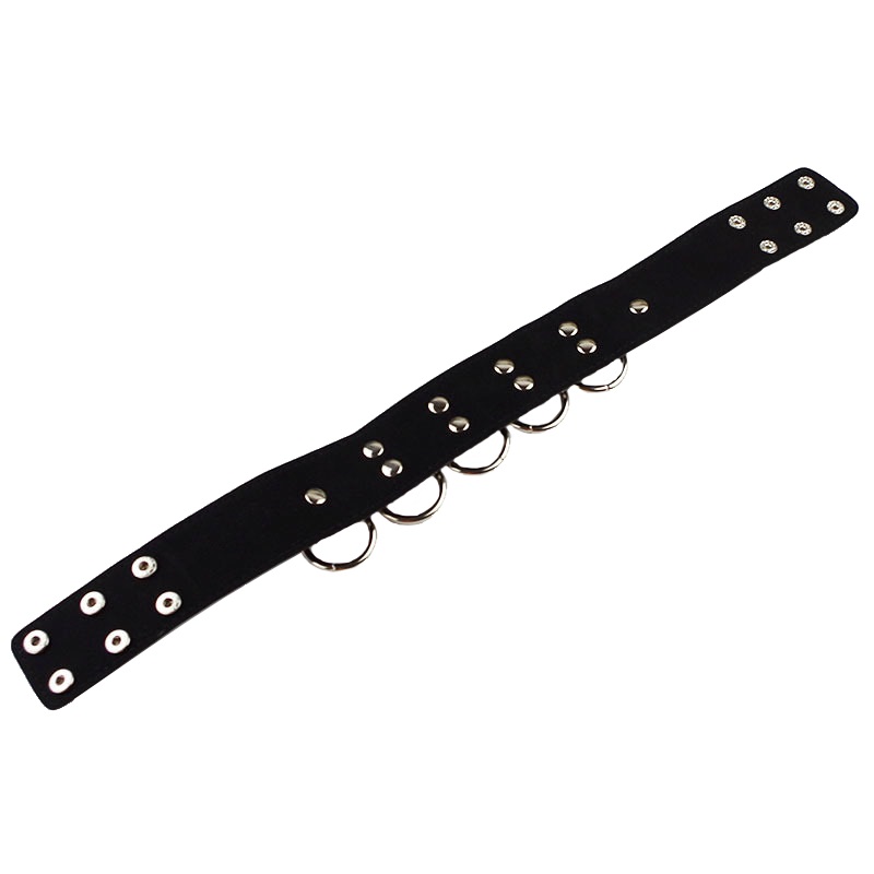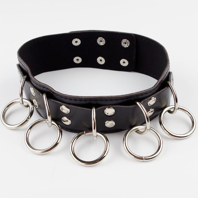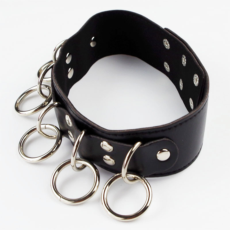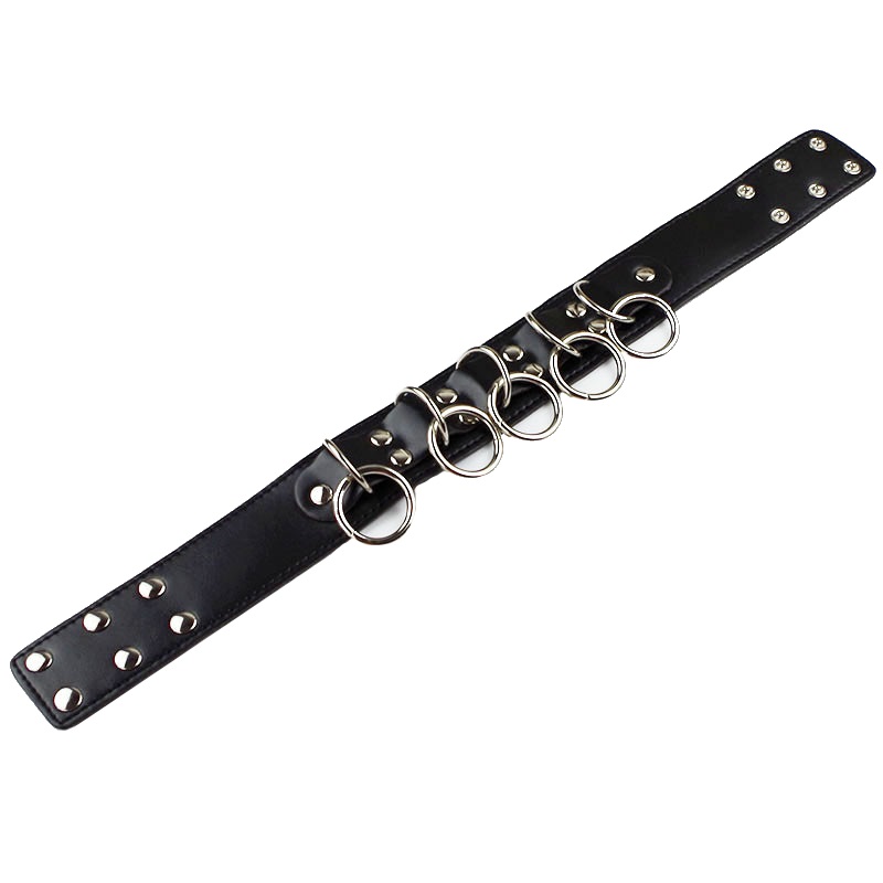 Ошейник украшен серебристыми металлическими кольцами, к которым по желанию могут быть пристёгнуты поводок и/или наручники.