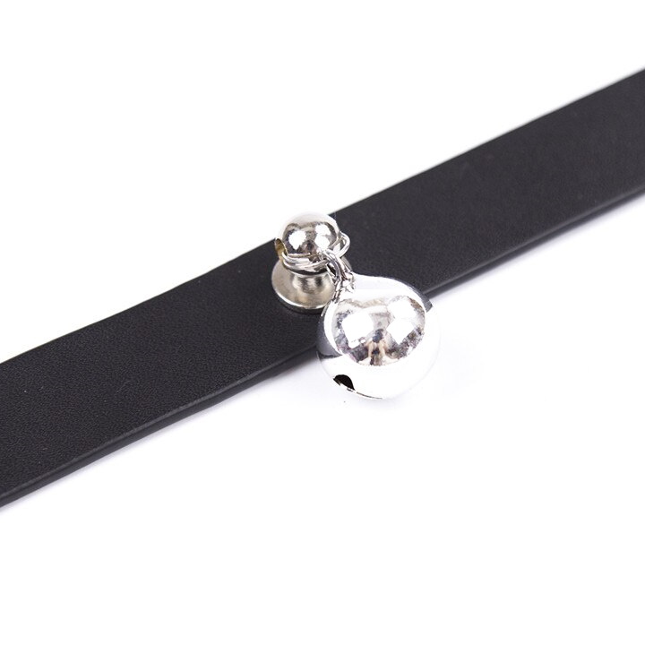 Оригинальный черный ошейник, декорированный колоколом. Крепление в виде застежки.