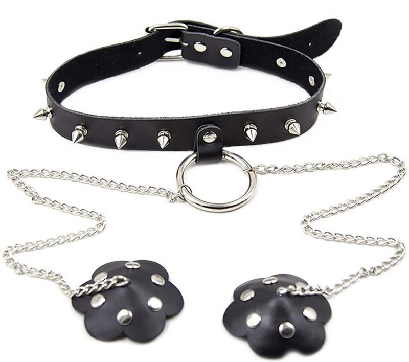 Ошейник украшен серебристыми металлическими шипами, так же от него отходят 2 цепочки, к которым крепятся зажимы для сосков.