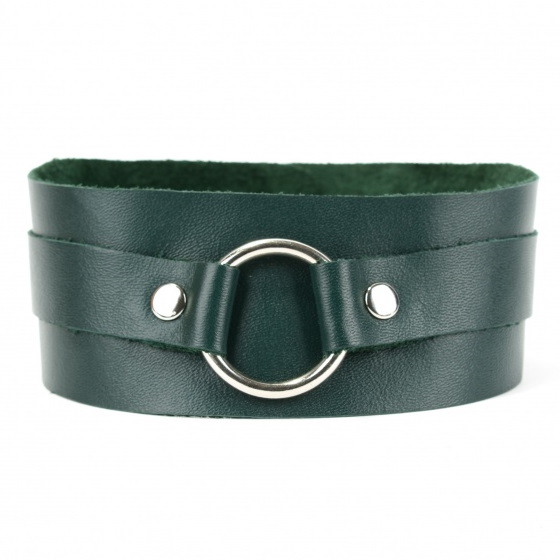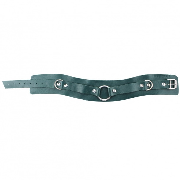 Ошейник выполнен из натуральной кожи изумрудного цвета, декорирован вставкой из черной замши, заклепками, металлическим кольцом и двумя полукольцами.