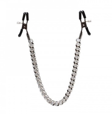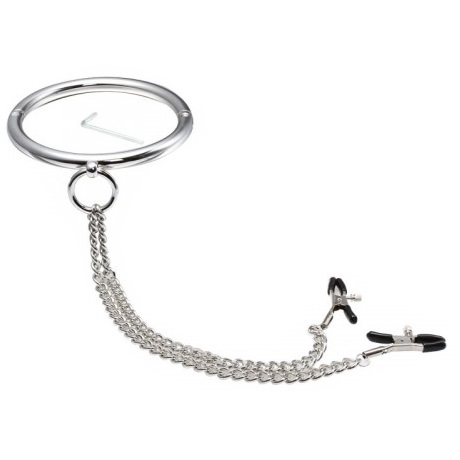На ошейнике металлическое кольцо, от которого идут зажимы на соски. Давление зажимов регулируется с помощью железного шурупчика.