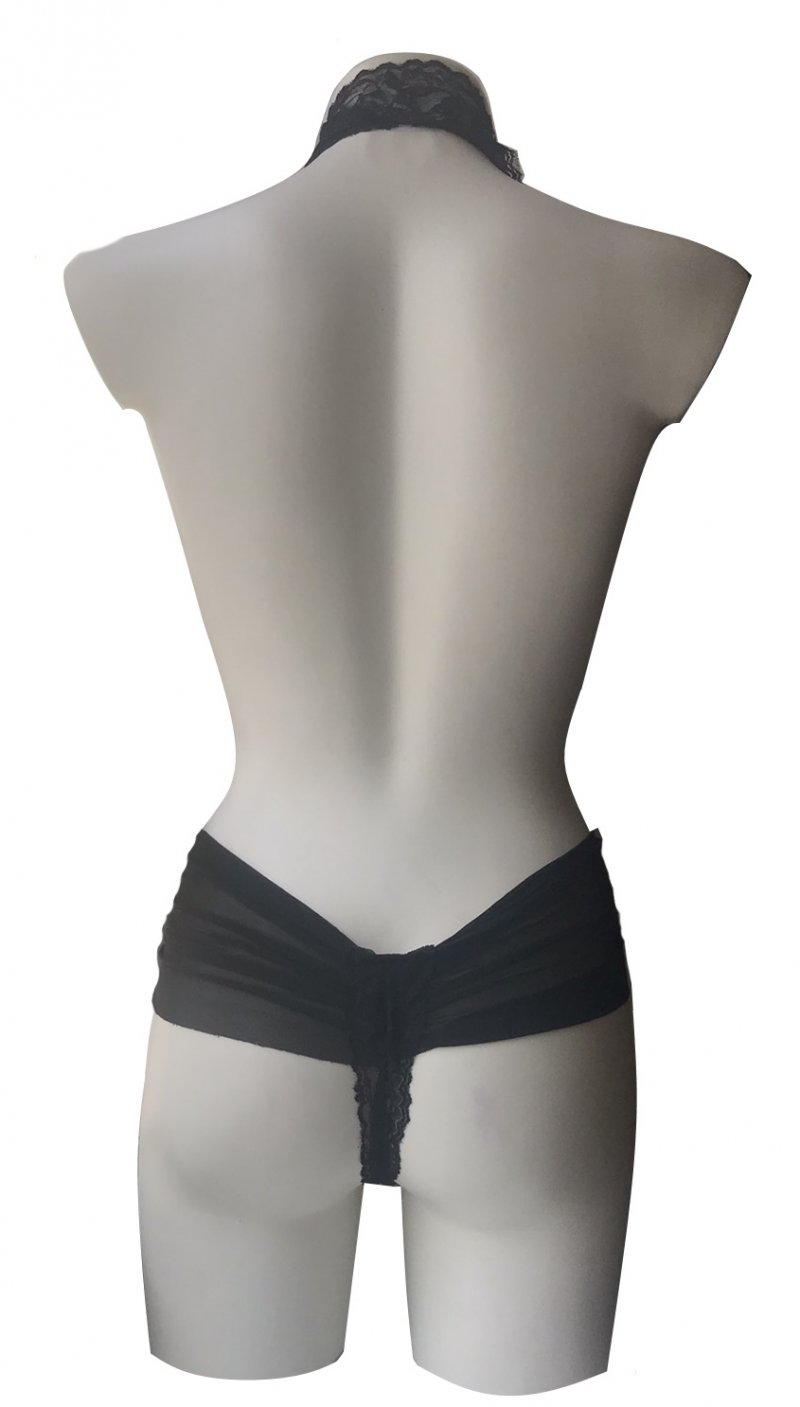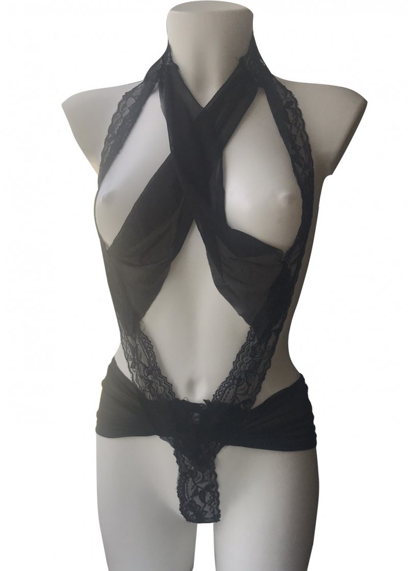 Восхитительное черное боди с глубоким вырезом украшено нежным цветочным кружевом. Необычный крой отрывает грудь, привлекая внимание.
