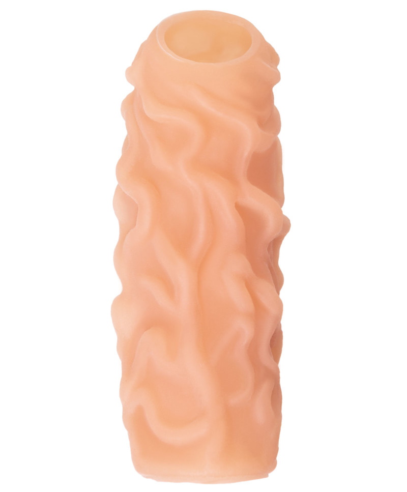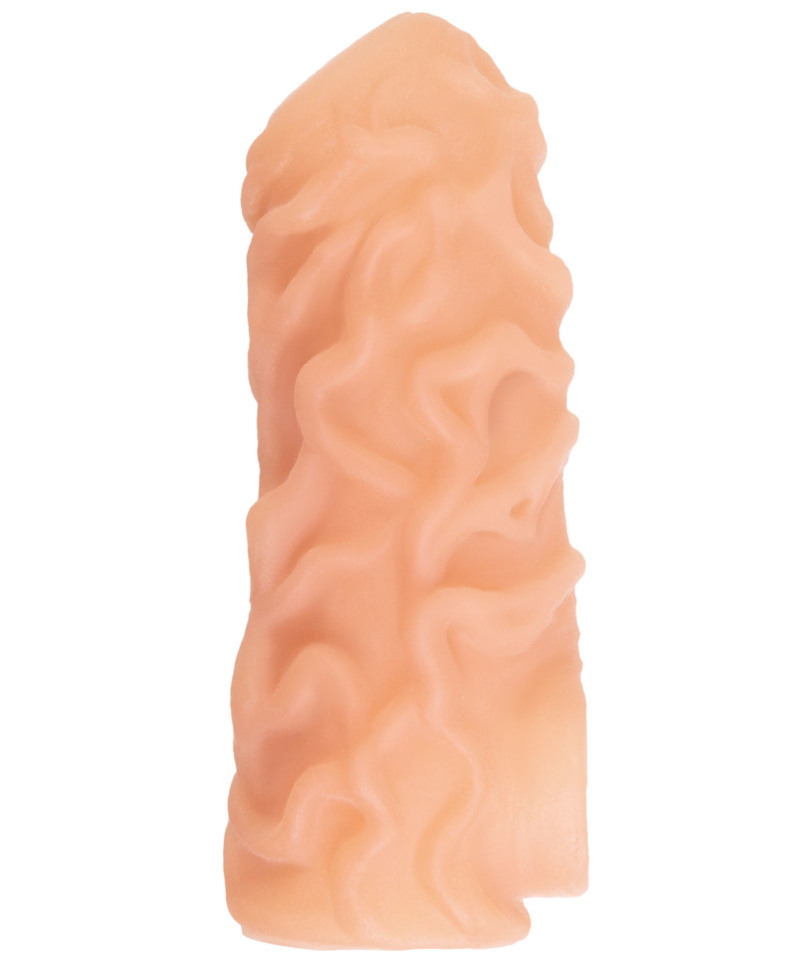 Насадка имеет форму “рукав”, плотно прилегает к пенису, создавая дополнительную толщину и оставляя головку открытой. Это позволяет сохранить чувствительность головки, задерживая эякуляцию. В основании есть отверстие для мошонки, с помощью которого вы надежно зафиксируете насадку на пенисе, не ограничиваясь в активных движениях. Насадка, за счет плотного облегания мошонки и головки, усиливает эрекцию.