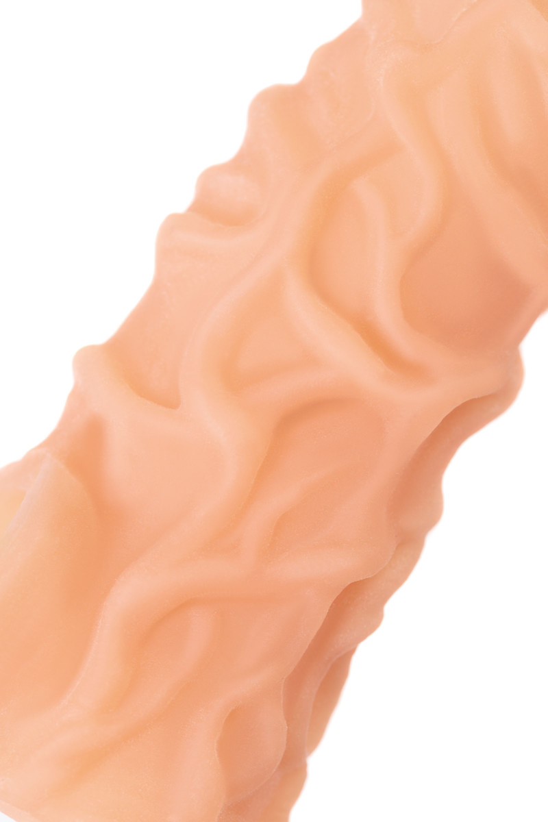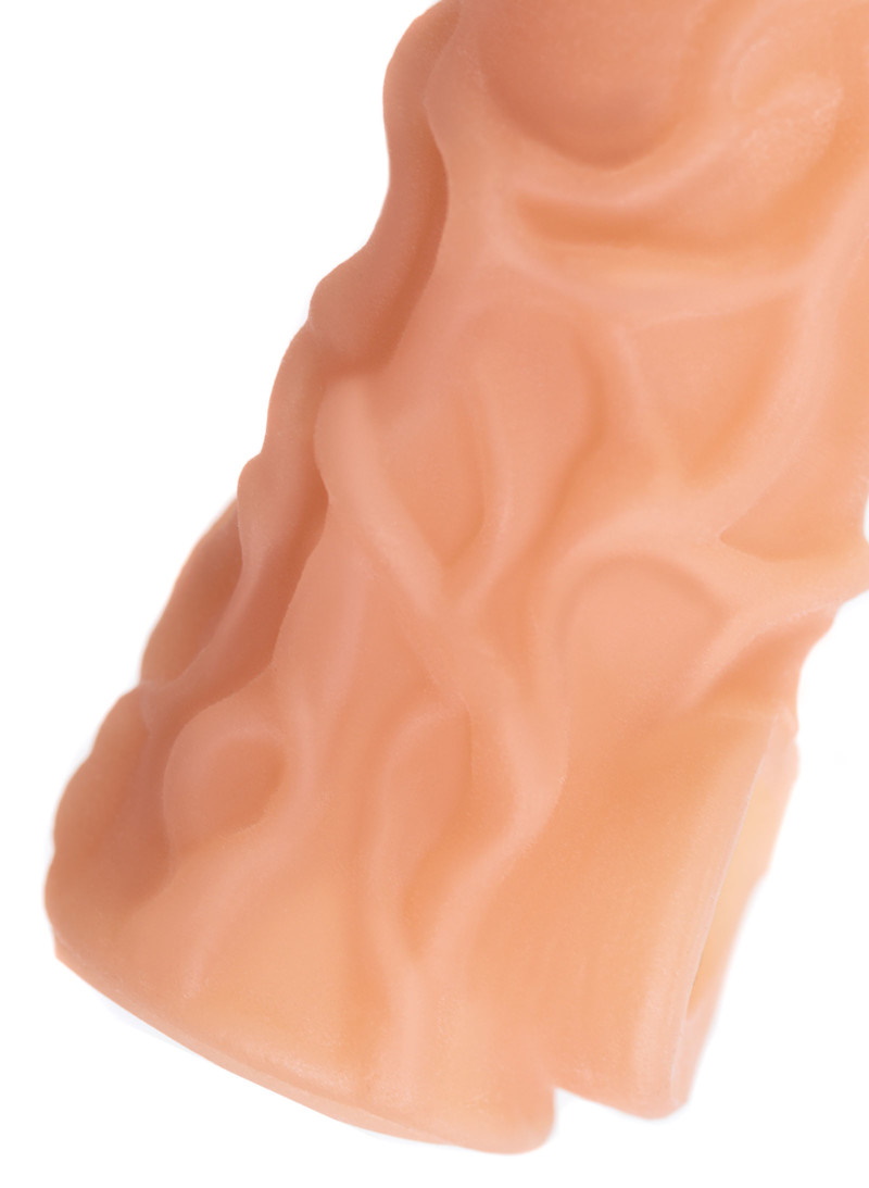 Ярко выраженный рельеф в виде многочисленных выпуклых вен по всему стволу насадки очень хорошо стимулирует зону G, вход во влагалище и настойчиво ласкает чувствительные зоны. Вариативность стимуляции регулируется активным темпом движения вперед-назад и изменением угла проникновения. Дополнительный объем дарит то самое чувство наполненности, увеличивая поток возбуждения. Мужчина тоже будет ощущать стимуляцию за счет давления стенок влагалища на пенис.
