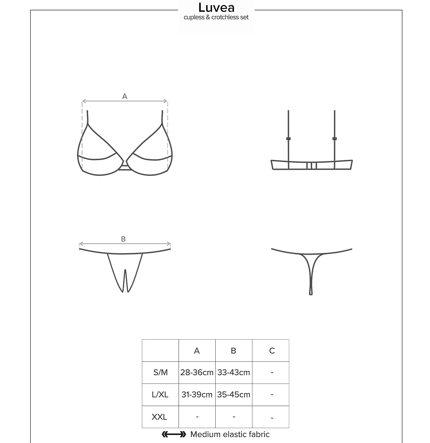 Детали: открытый комплект Luvae выполнен из кружева черного цвета, открытый бюстгальтер с бижутерией и кружевом - добавит пикантности, чашки с косточками и укреплением - поддержат бюст и придадут груди соблазнительную форму, декорированные регулируемые бретельки и застежка обеспечат идеальную посадку, кружевные трусики-стринги с открытой промежностью - залог острых ощущений и красивого вида ягодиц, эластичная и мягкая ткань Multistretch.
