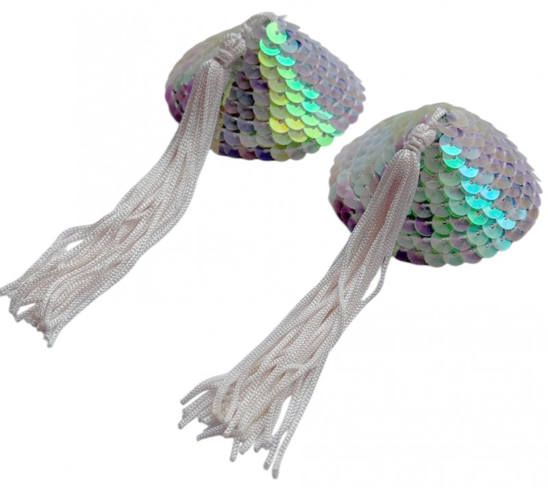 Вы выглядите таинственно и пробуждаете фантазию — расшитые пайетками декоративные накладки на соски с мягкими кисточками белого цвета великолепно прикрывают область грудного соска.