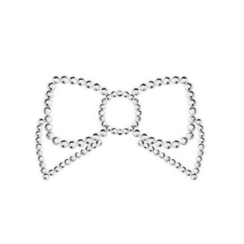 В комплект входят 2 наклейки на соски из множества серебристых кристаллов, создающих из себя красивый бантик в центе которых находиться сосок.