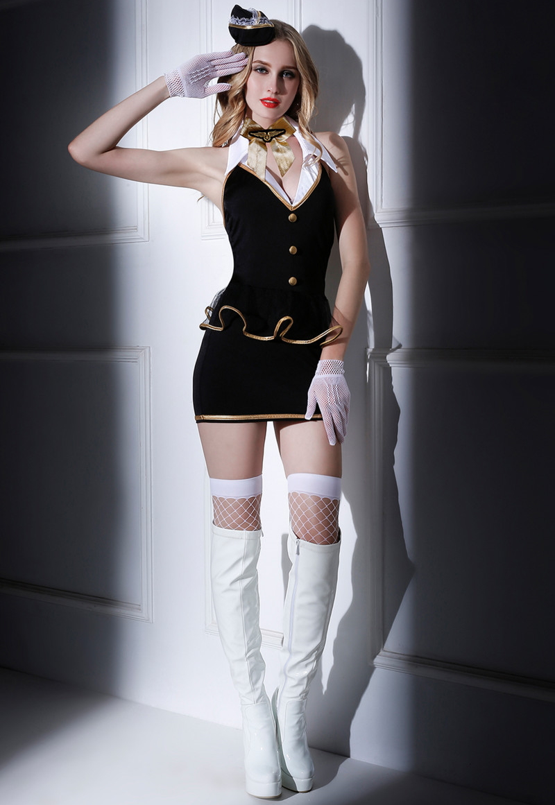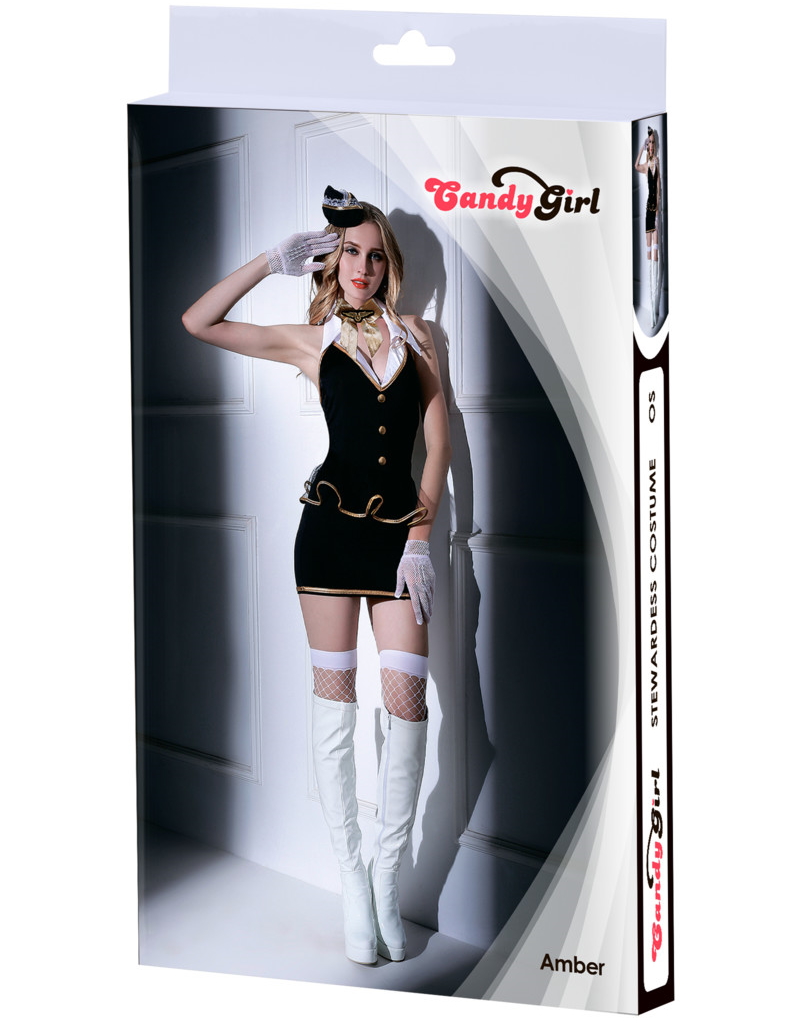 Трикотажное платье с контрастной отделкой, пуговицами, отложным воротником и оборками из тонкой сетки смотрелось бы скучно, если бы не открытая спина и ягодицы костюма стюардессы Candy Girl Amber!