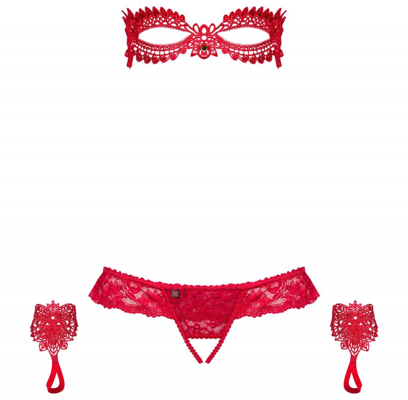 Детали: насыщенный красный цвет, гипюровая маска для глаз на резинке, гипюровая маска для глаз на резинке, гипюровые перчатки с ушком для пальца, кружевные стринги с открытой промежностью, украшения на маске и трусиках, нежная и эластичная ткань плюс элементы гипюра.