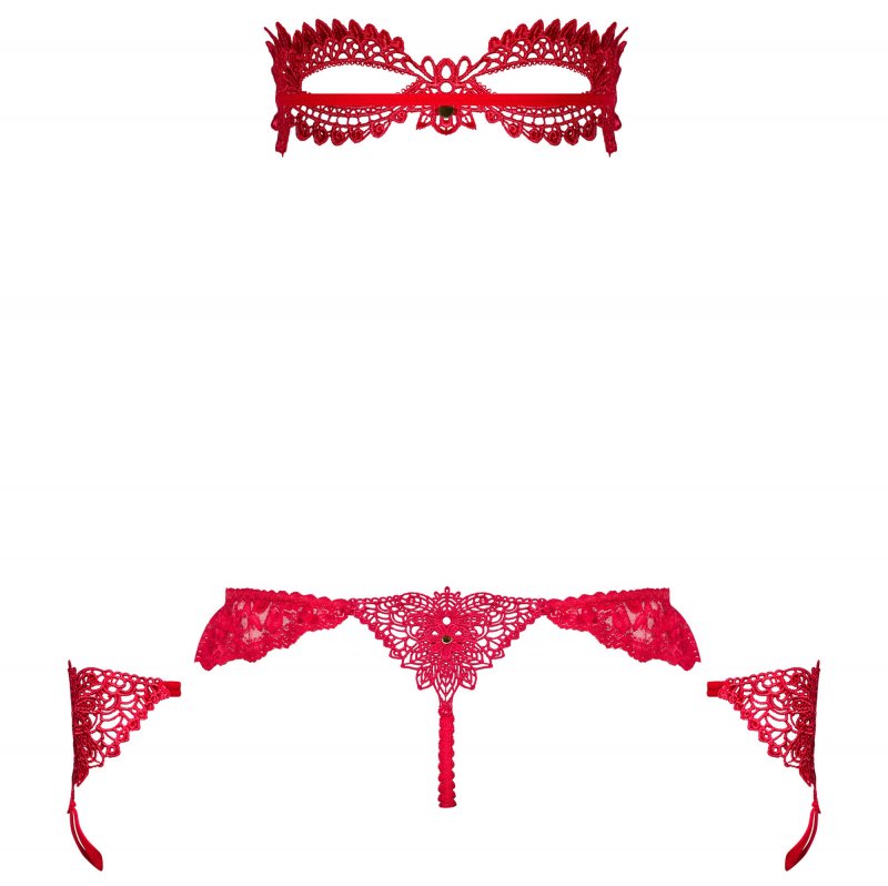 Детали: насыщенный красный цвет, гипюровая маска для глаз на резинке, гипюровая маска для глаз на резинке, гипюровые перчатки с ушком для пальца, кружевные стринги с открытой промежностью, украшения на маске и трусиках, нежная и эластичная ткань плюс элементы гипюра.