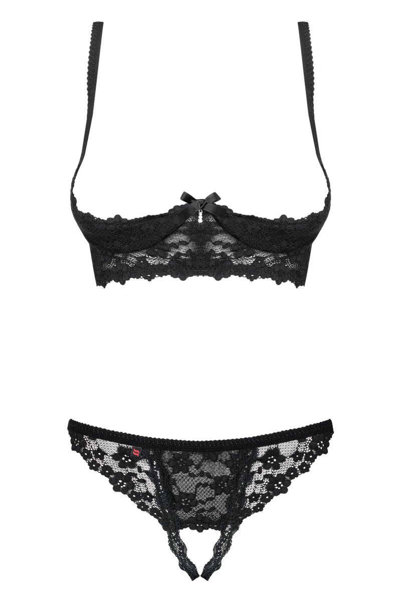 Детали: бюстгальтер с открытыми чашечками, чашечки на косточках поддержат бюст и придадут необходимую форму груди, регулируемые бретельки и многоступенчатая застежка обеспечат идеальную посадку, кокетливый бантик и подвеска на лифе, великолепное черное кружево с цветочным узором - женственно и сексуально, соблазнительные стринги с открытой промежностью - гарантия необычайного восторга, нежный и эластичный материал Multistretch.