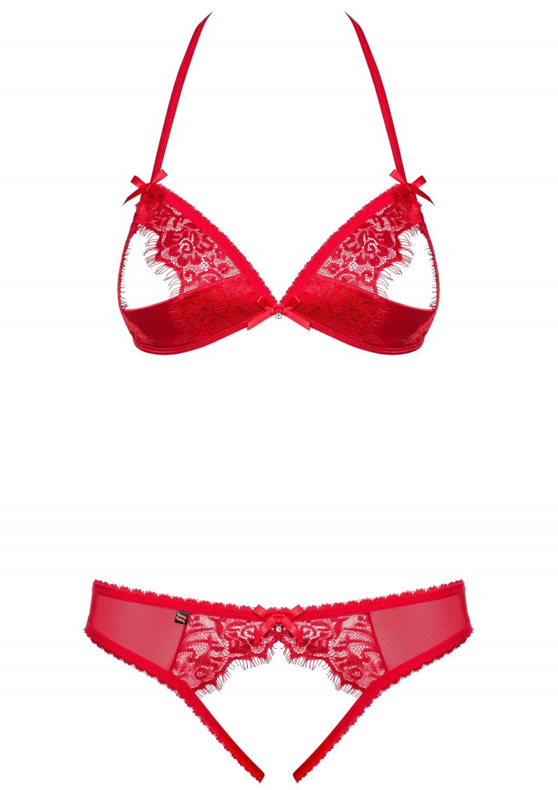 Комплект насыщенно красного цвета состоит из открытого бюстгальтера и трусиков открытой промежностью - мы от них без ума!