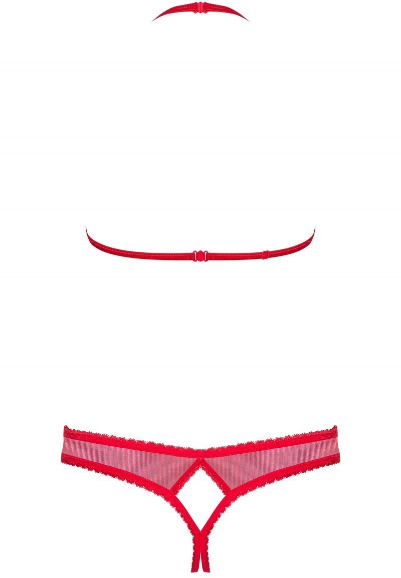 Детали: насыщенный красный цвет, сочетание полупрозрачной сеточки и кружева, открытый бюстгальтер с кружевом - добавит пикантности, небольшой пуш-ап для лучшей поддержки груди, регулируемые бретели и застежка на спине - Did2Fit - гарантия идеальной посадки, застежка на шее, декор в виде бантиков и маленьких блестящих камушков, трусики-стринги с открытой промежностью - залог острых ощущений и красивого вида ягодиц, эластичная и мягкая ткань Multistretch.
