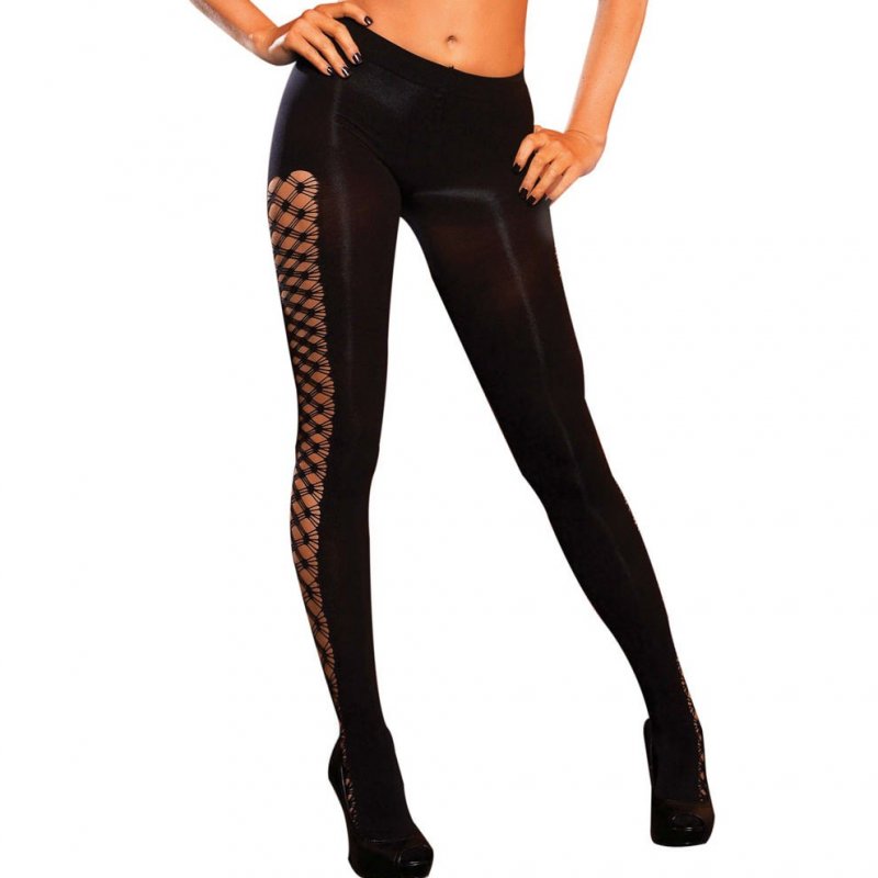 Черные эластичные плотные колготки с необычной шнуровкой сбоку. Смотрятся необыкновенно привлекательно и эротично. Размер колготок универсальный.