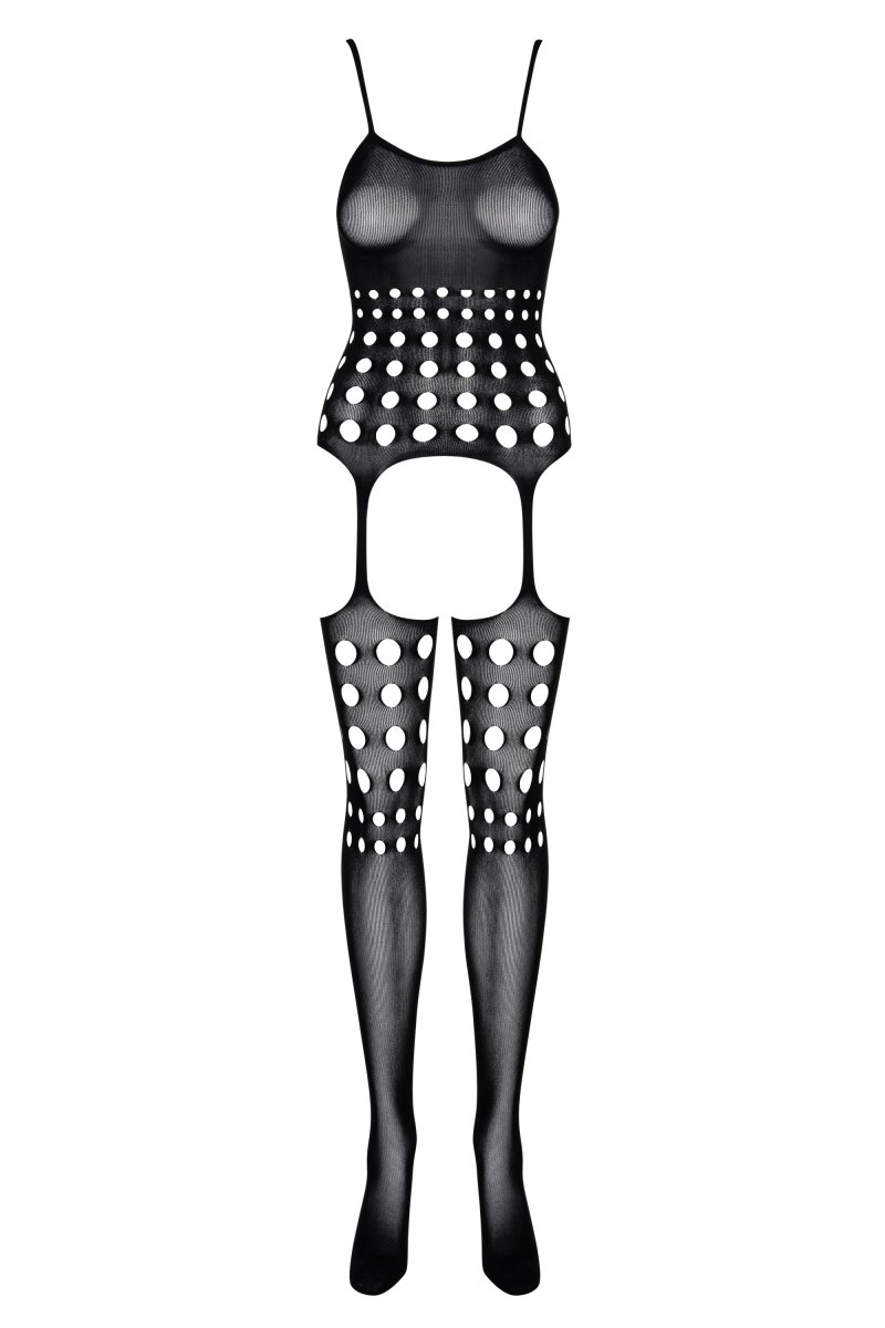 Кэтсьюит выполнен из красивой эластичной ткани черного цвета и представляет собой сочетание соблазнительного верха, пояса для чулок и самих чулочков.