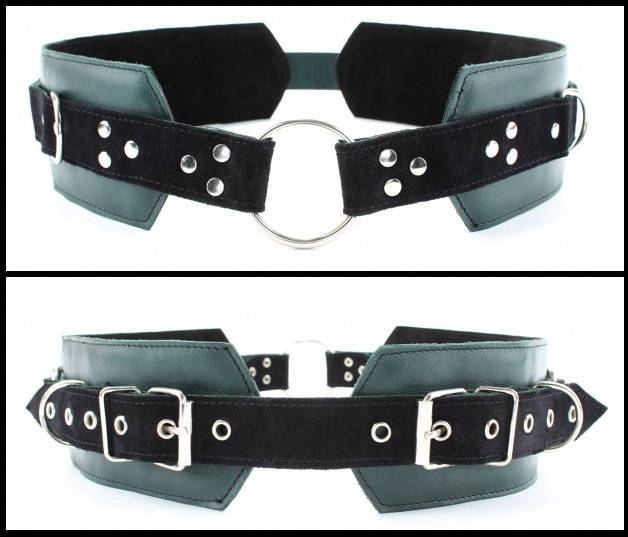 Пояс выполнен из натуральной кожи изумрудного цвета, декорирован ремнями из черной замши, тремя металлическими кольцами и четырьмя полукольцами.