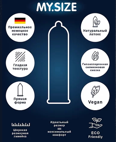 - Презервативы НЕ содержат продуктов животного происхождения (в обычных презервативах в составе есть животный белок казеин). My.Size могут использовать даже веганы и люди с религиозными ограничениями.