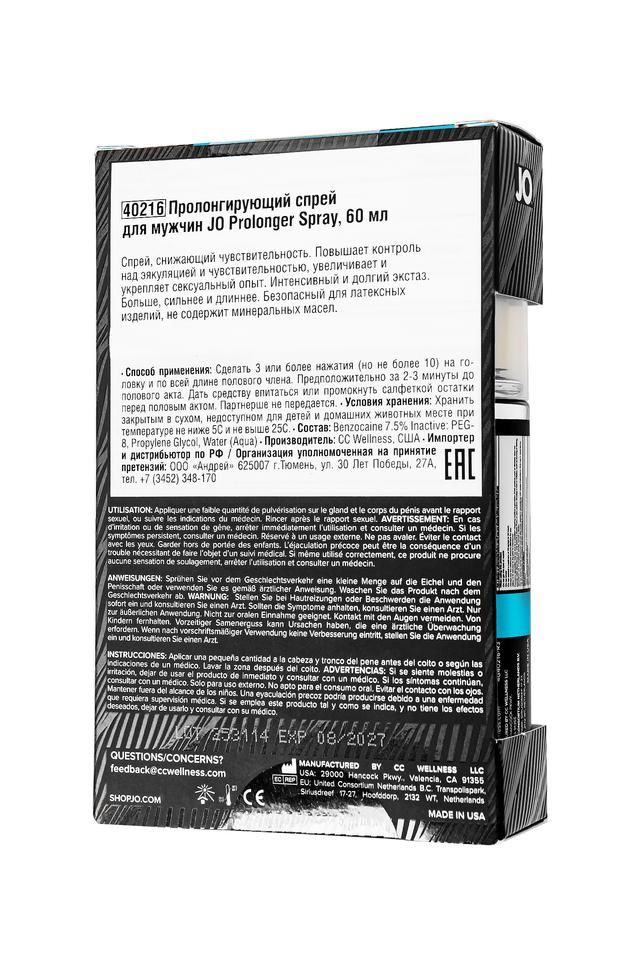 Безопасность: Совместим с латексными изделиями, рекомендован профессионалами. Откройте для себя мир продолжительного удовольствия и более тесной связи с JO Prolonger Spray — для тех, кто хочет большего, сильнее и дольше. JO Prolonger Spray – это ваш секрет продолжительного удовольствия для мужчин