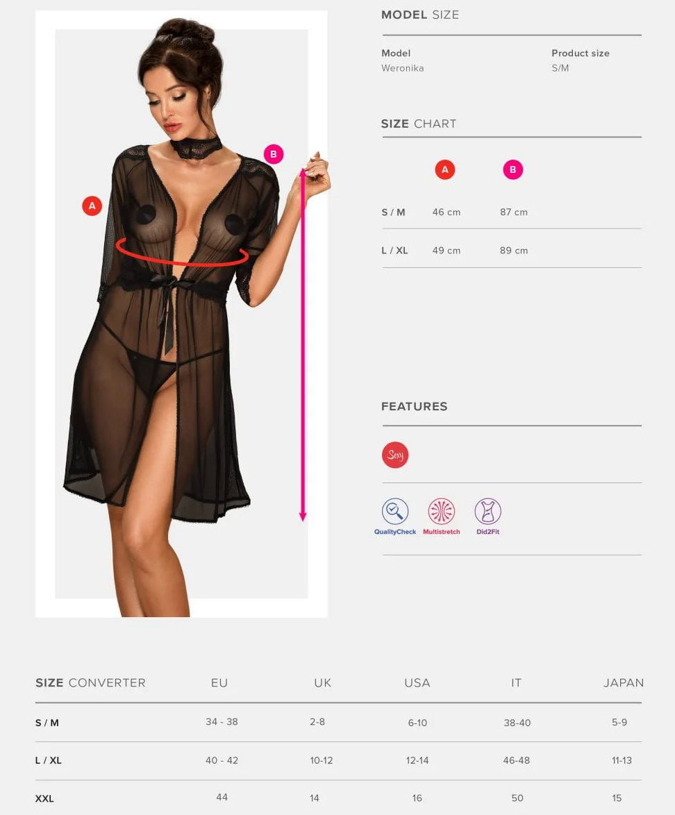 Комплект включает в себя пеньюар, чокер и кружевной пояс.